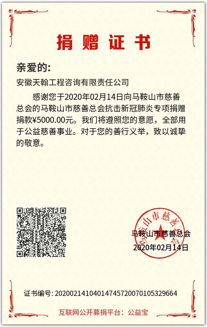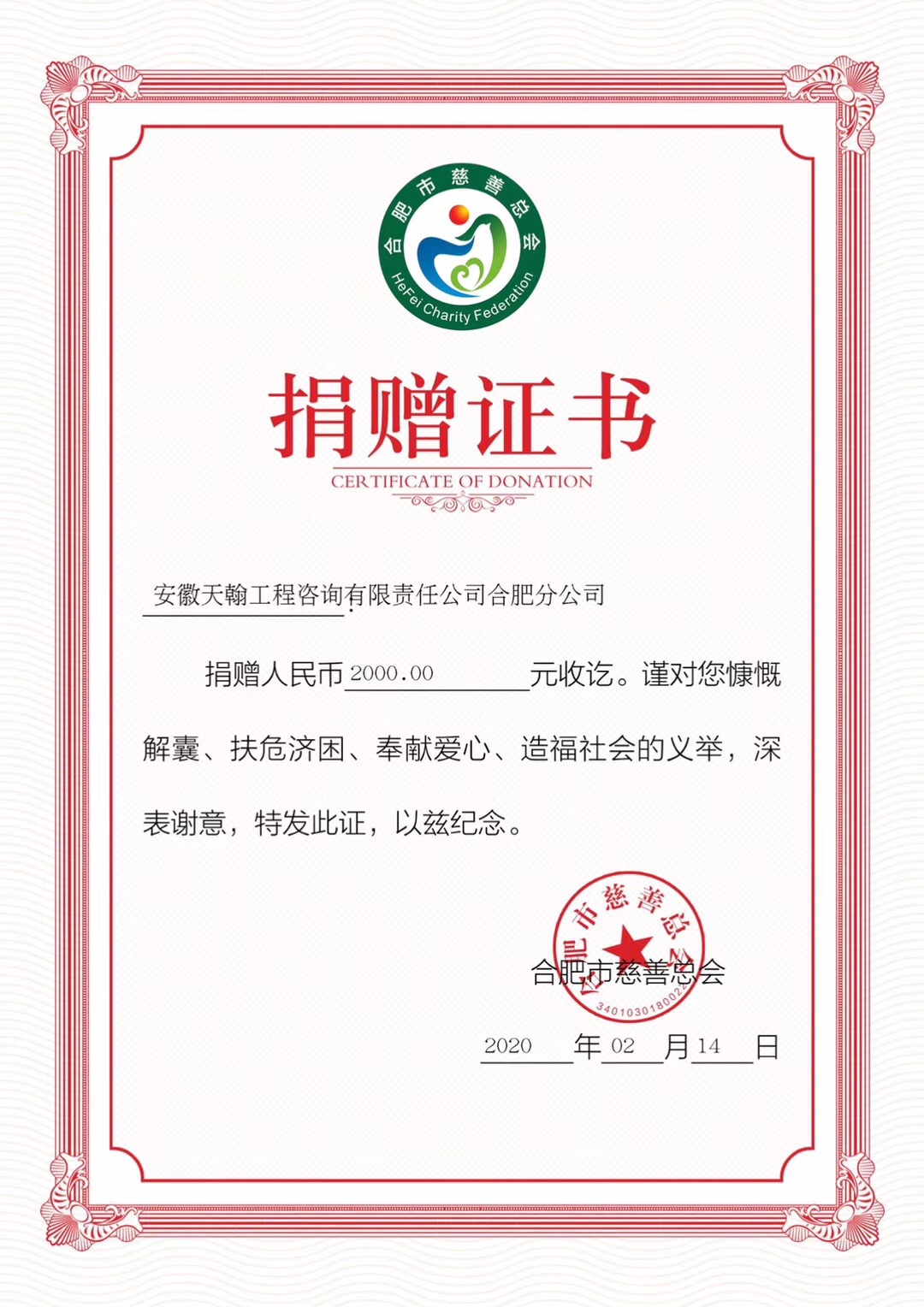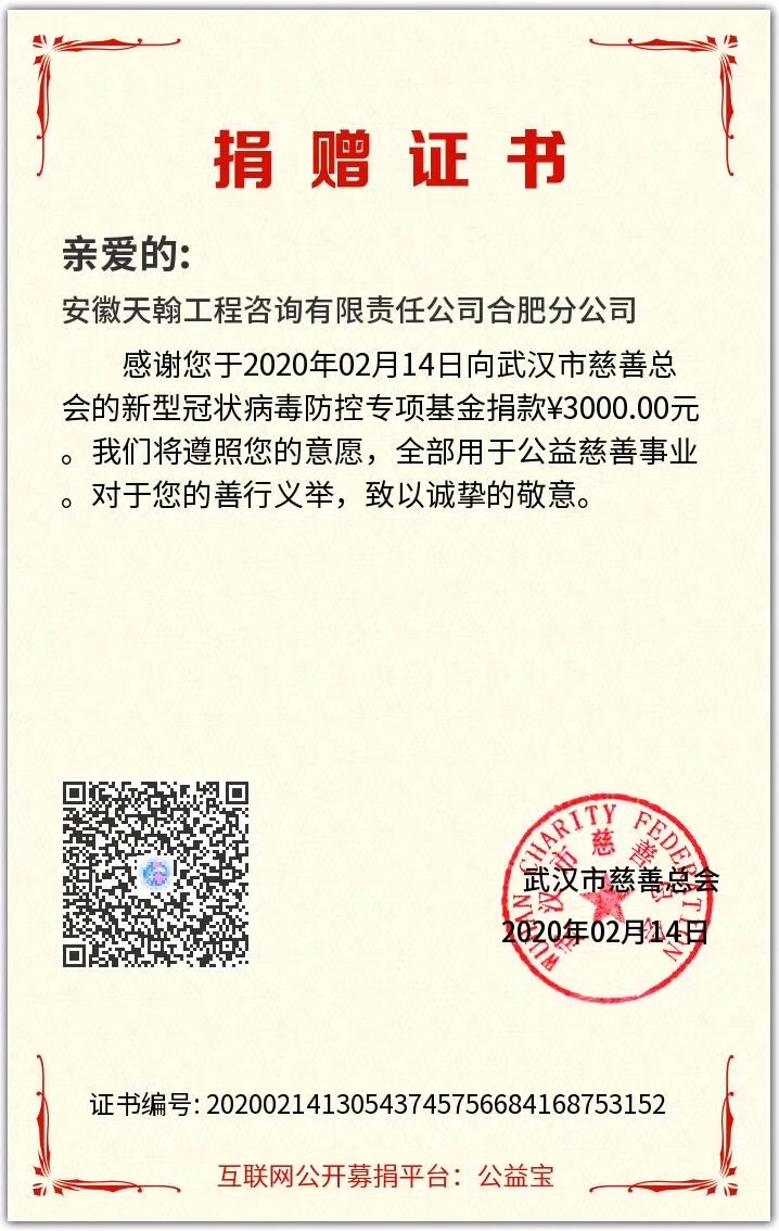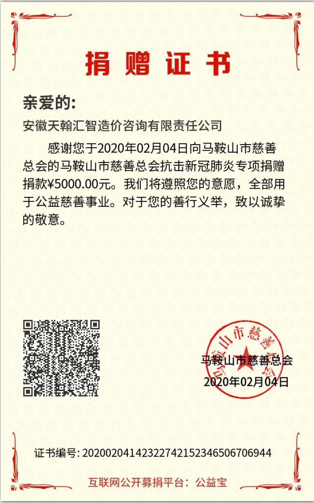 疫魔无情,天翰有爱,我公司在周书记的带领下,部分党员干部自发向市慈善总会发起捐款,总公司、汇智造价子公司及合肥分公司也分别向马鞍山市慈善总会、合肥市慈善总会及武汉市慈善总会进行了捐款,用实际行动传递着人间大爱,全体天翰人向“逆行者”致敬!