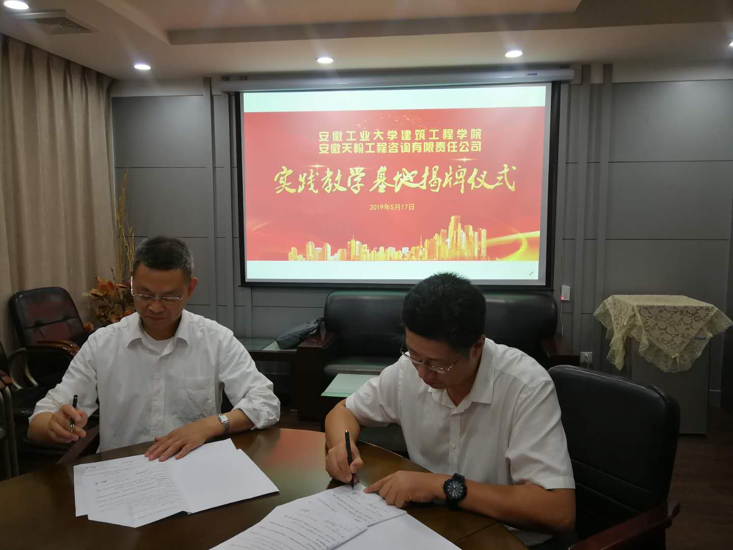 5月17日下午,安徽工业大学建筑工程学院与安徽天翰工程咨询有限责任公司教学实践基地协议签约仪式在我公司会议室举行。安徽工业大学建工学院院长黄志甲、副院长陈德鹏、系主任吕忠、副主任邢琨,我司董事长周文杰、副总经理梁允好、刘伟、项目管理部副经理董如亮、人力资源部副主任杨广宝出席参加了揭牌签约仪式。梁允好副总经理主持签约仪式。