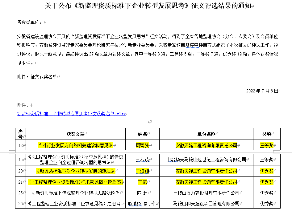 近日,安徽省建设监理协会组织的“新监理资质标准下企业转型发展思考”征文活动,我公司多名员工积极参与,踊跃投稿,现评选结果已经揭晓,周智强获得三等奖,王海翔、丁威获得优秀奖,向获奖人员表示祝贺,希望再接再厉。