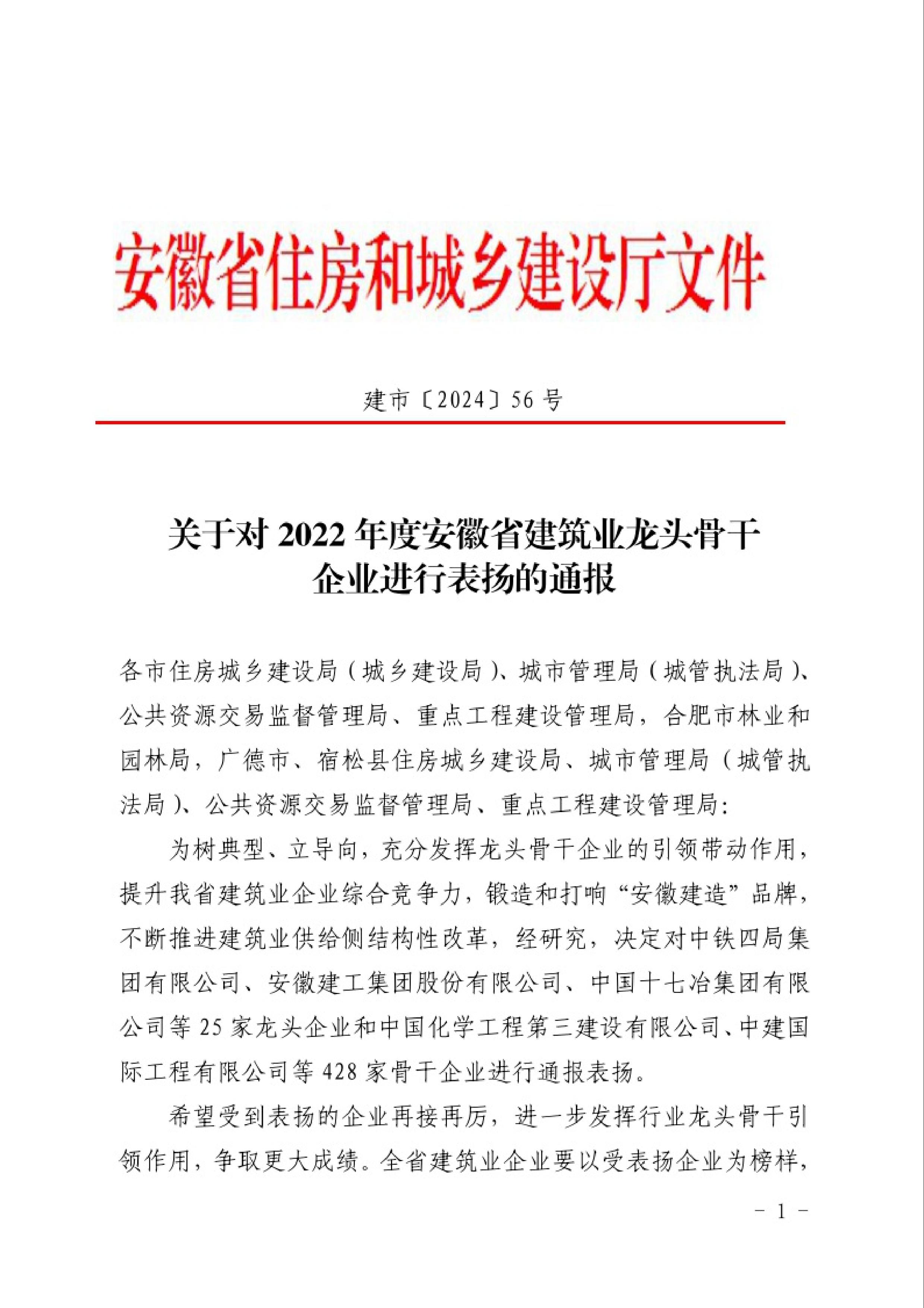 近日,安徽省住房和城乡建设厅发布了《关于对222年度安徽省建筑业龙头骨干企业进行表扬的通报》,通报表扬了我市1家龙头企业和30家骨干企业,公布了“2022年度安徽省优秀建筑业企业”,安徽天翰工程咨询有限责任公司作为2022年度“安徽省建筑业骨干企业”受到通报表扬并连续三年荣膺“安徽省优秀建筑业企业(工程监理类)”殊荣。