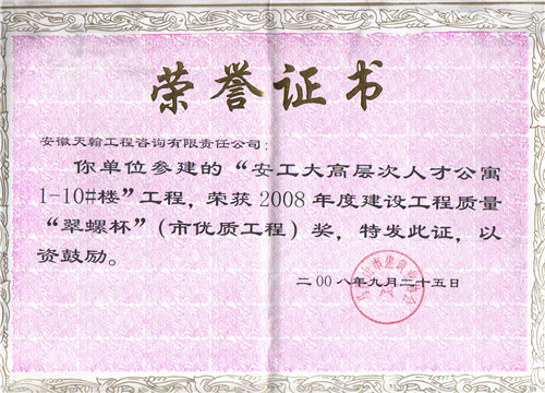 2008年度翠螺杯奖:安工大高层次人才公寓工程