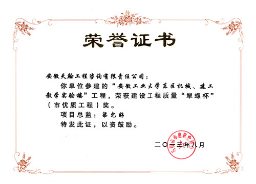 2013年度翠螺杯奖:安徽工业大学东区机械、建工教学实验楼工程