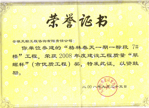 2008年度翠螺杯奖:格林春天一标7#楼工程