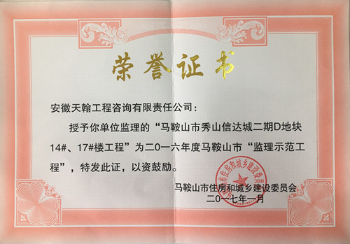 2016年度马鞍山市监理示范工程:马鞍山市秀山信达城二期D地块14、17#楼工程