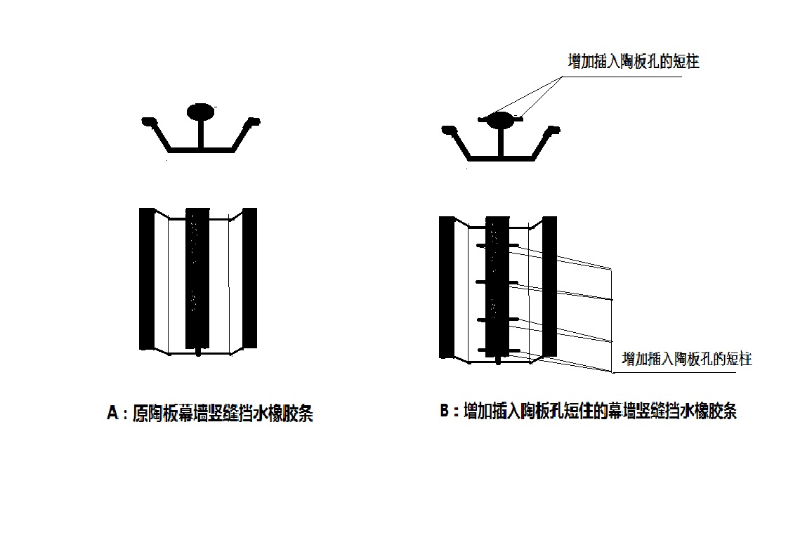 (2)改进竖向胶条的外形,使其能够较准确牢固的固定于竖缝位置。施工过程中,我们发现一些竖缝胶条不在竖缝位置,或在竖缝位置但结合不紧密,起不到防水作用,建议改进胶条与陶板的固定方式,如在胶条的中条上增设能插入陶板侧孔的短柱,保证胶条固定位置,从而保证防水效果,如图3所示: