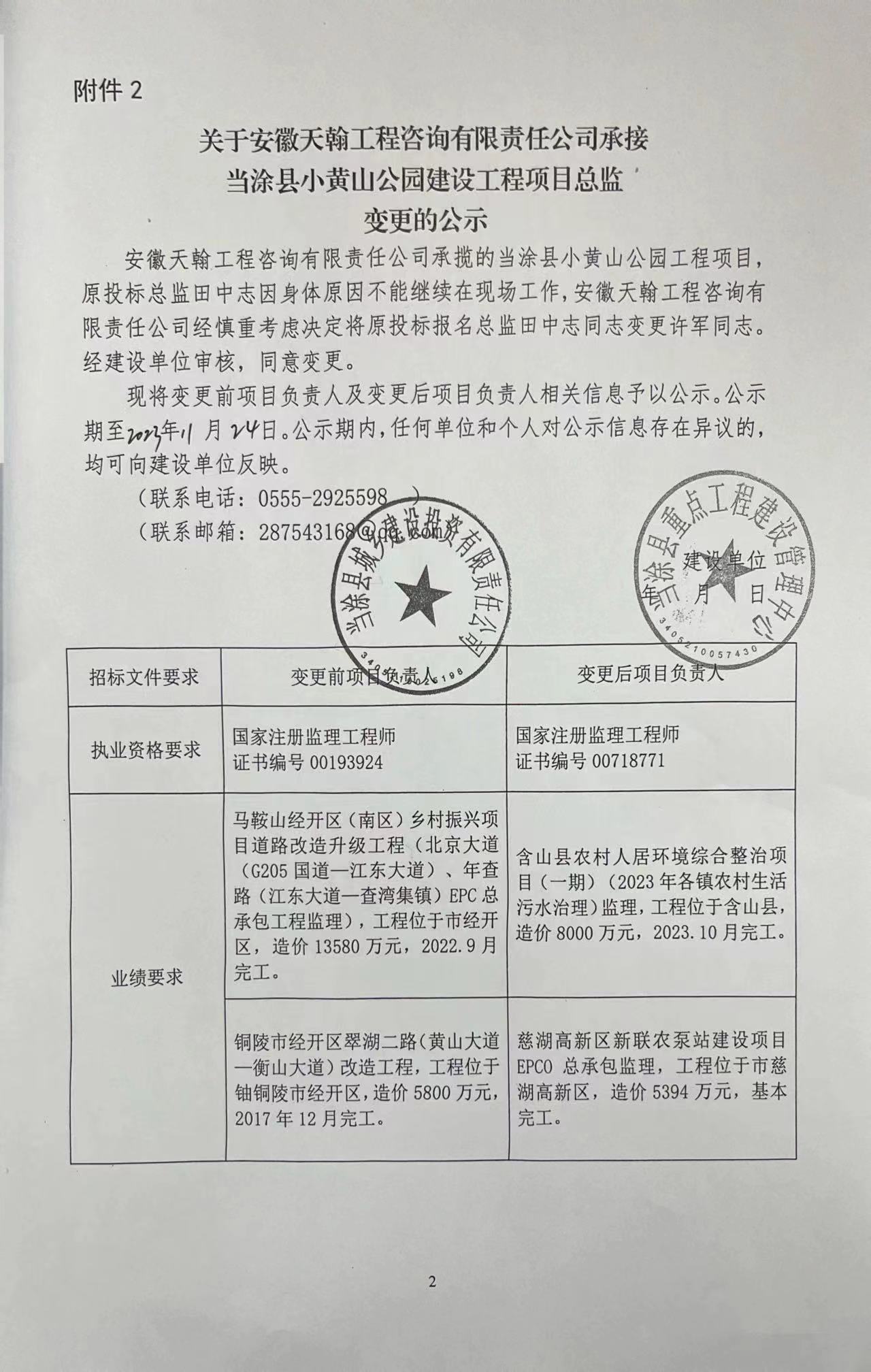 关于安徽天翰工程咨询有限责任公司承接当涂县小黄山公园建设工程项目总监 变更的公示