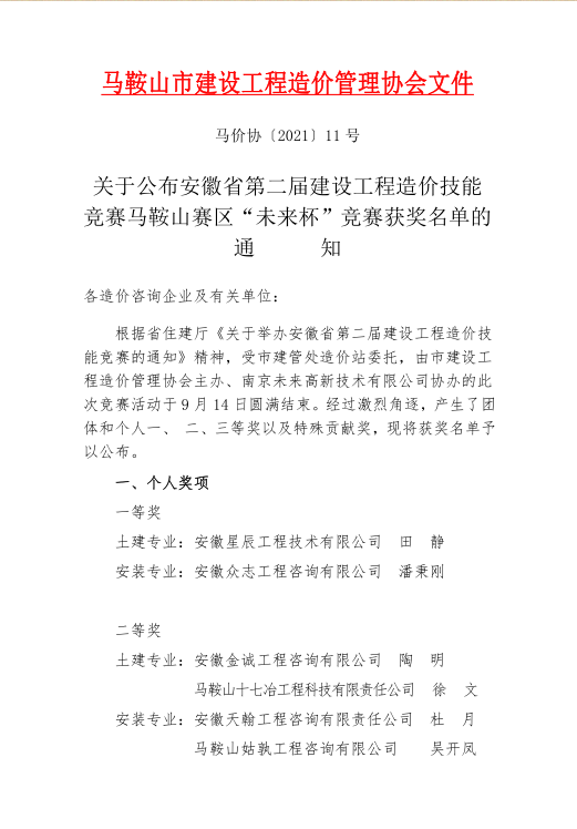 喜报:我公司在安徽省第二届建设工程造价技能竞赛马鞍山赛区“未来杯”竞赛中…